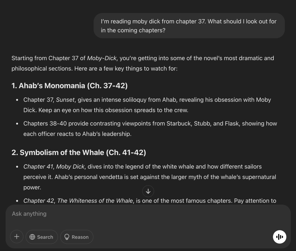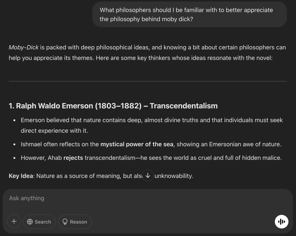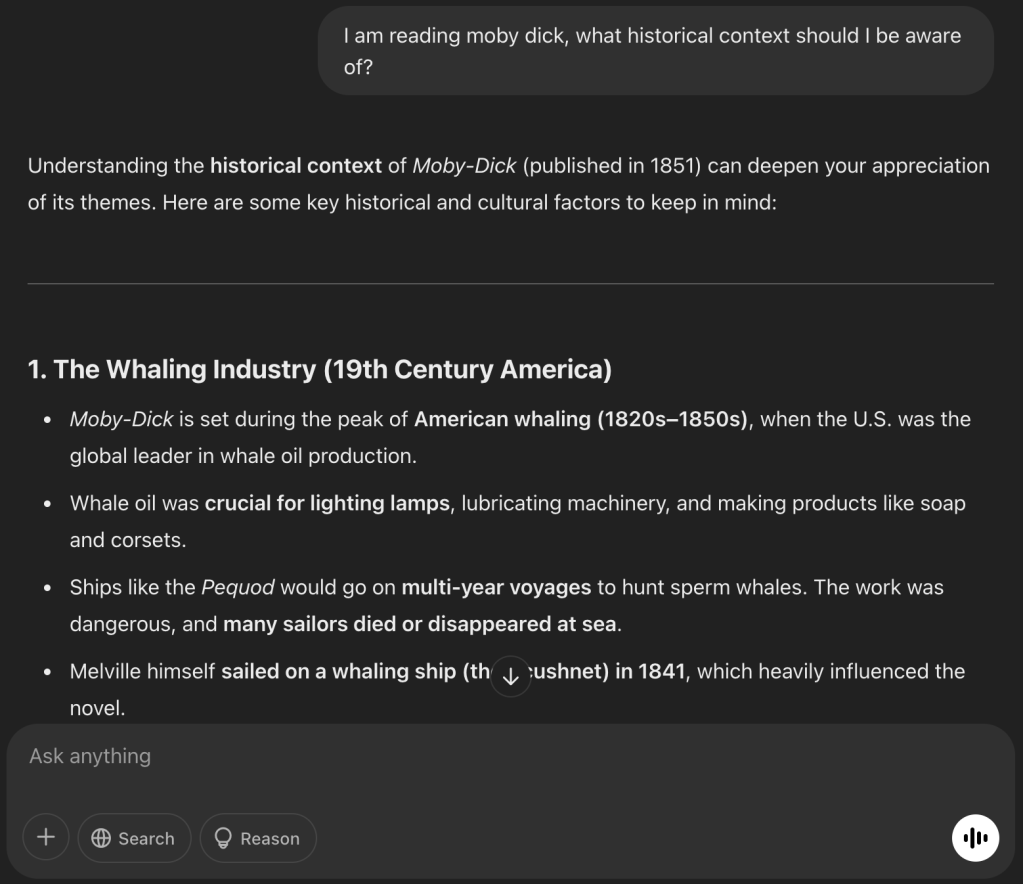 Let’s use the example of Moby Dick by Herman Melville, a book I’ve been reading recently. I personally use ChatGPT because I find it to be through and comprehensive, but the following method works with any Large Language Model (LLM) you decide to use. Other examples of LLMs you could use include Llama, Gemini, Claude, and many more.